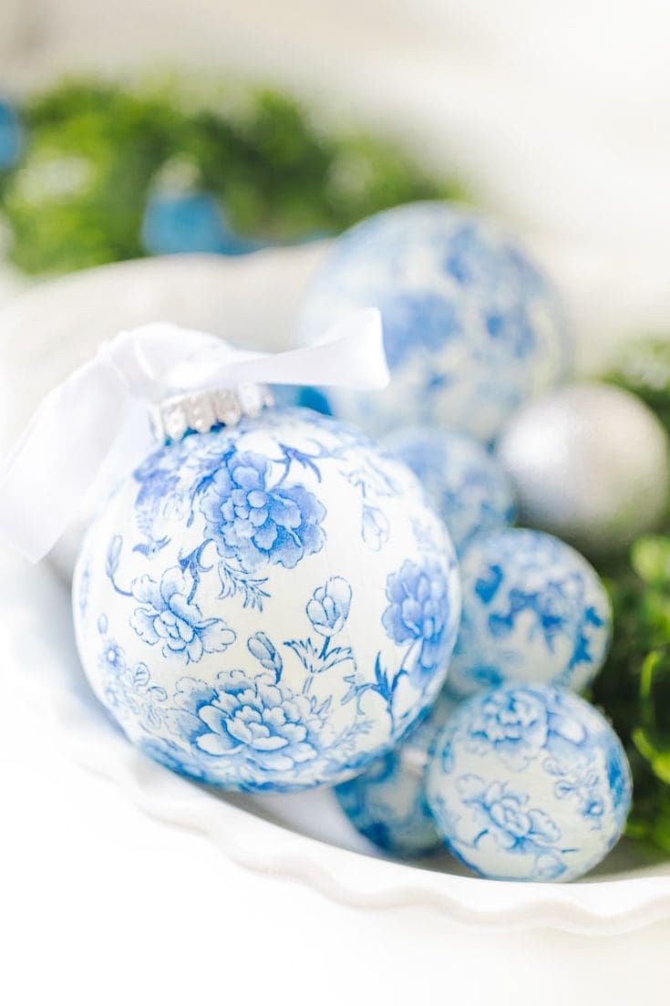 You know the whole “If You Give a Mouse a Cookie” story? Well, turns out craft projects are my proverbial cookies. I loved making these DIY chinoiserie pumpkins so much that decoupage ornaments were the obvious next sequential step. Just like my beloved pumpkins, these DIY chinoiserie Christmas ornaments are seriously so easy to make, even if you aren’t particularly crafty, and they compliment existing blue and white Christmas decor beautifully! That being said, you can choose whatever paper cocktail napkins you like for this project, so if you’re more into a traditional red and green Christmas or whimsical white and pink color scheme, this decoupage method works for those, too. Keep reading for a step-by-step decoupage ornaments tutorial and short how-to video!
