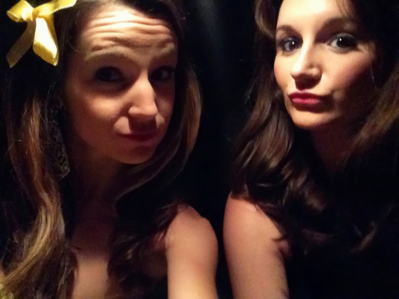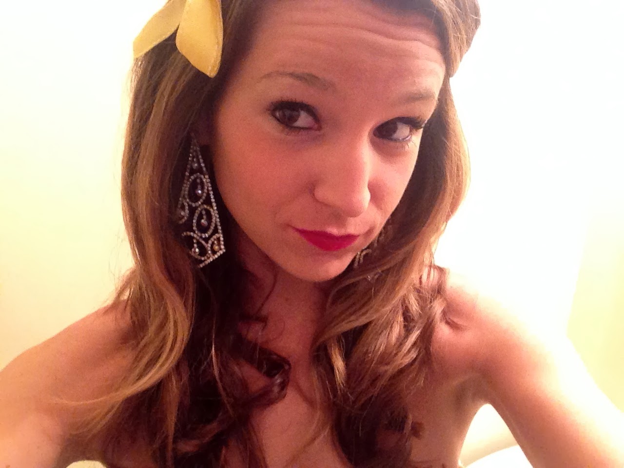 Modern Day Belle Costume: Betsey Johnson yellow cocktail dress with a sweetheart neckline from 2008 (vintage!), gold bow, gold heels, curled hair (which fell unfortunately), and rhinestone jewelry– easy peasy.