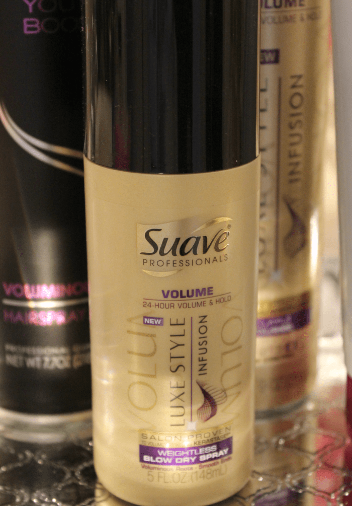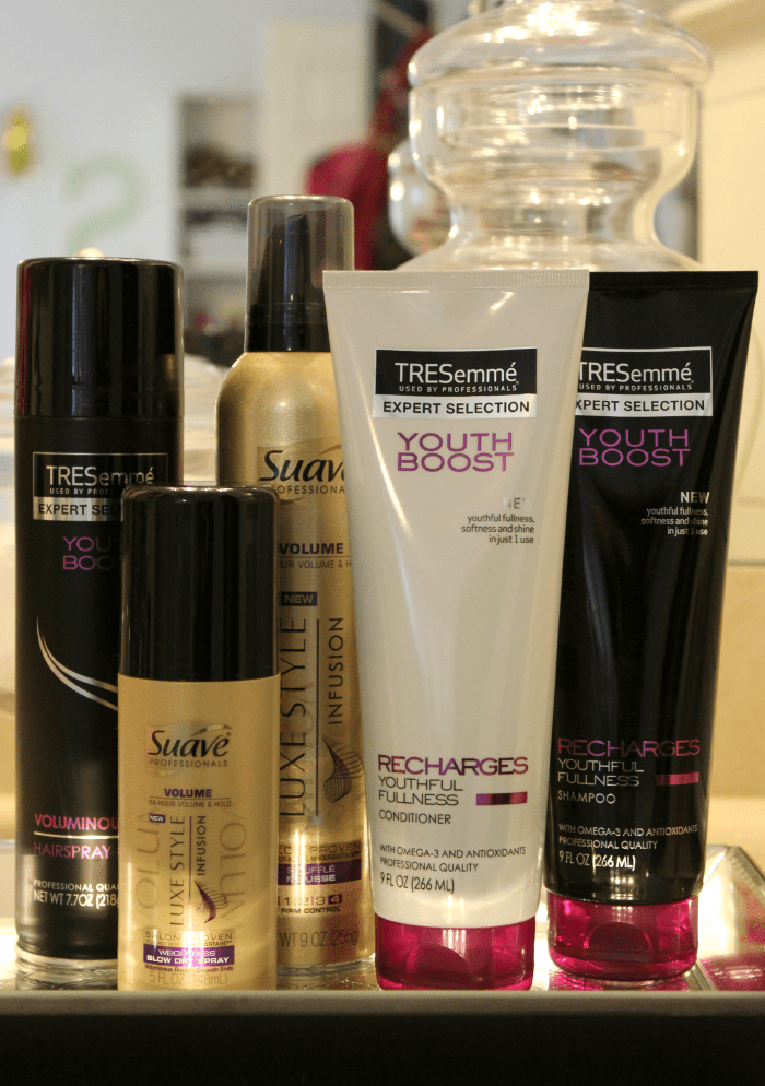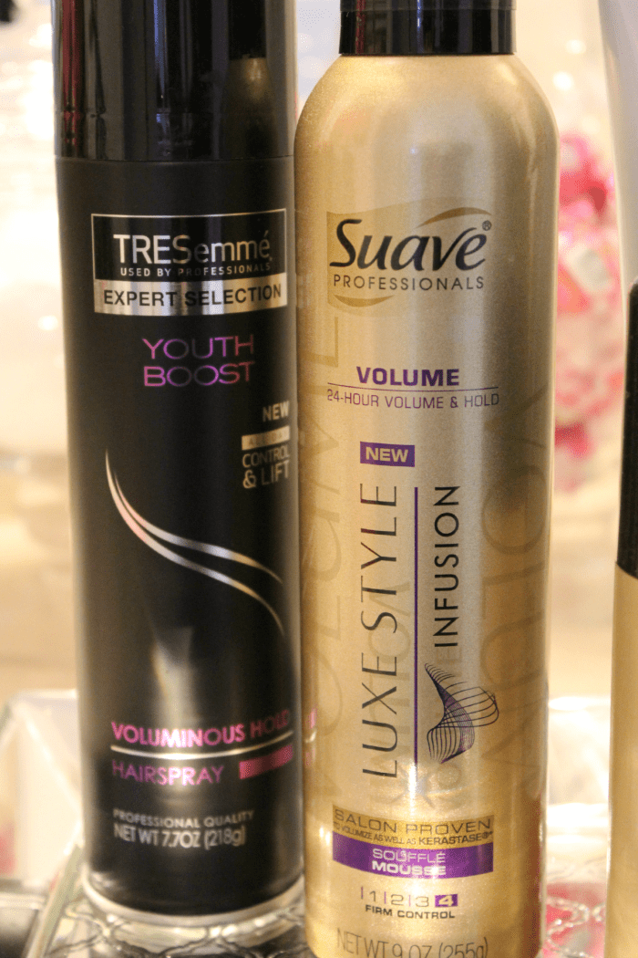 Before you jump to conclusions– no, I’m not using $50 hairspray or hormone-enhanced mousse or anything. This routine consists of 8 easy steps and 5 essential products… all available at Walmart. I use TRESemmé Youth Boost Shampoo, TRESemmé Youth Boost Conditioner, Suave Professional Luxe Style Soufflé Mousse, TRESemmé Youth Boost Voluminous Hold Hairspray, and Suave Luxe Style Weightless Blow Dry Spray, and my hair looks, smells, and stays voluminously fabulous every time.