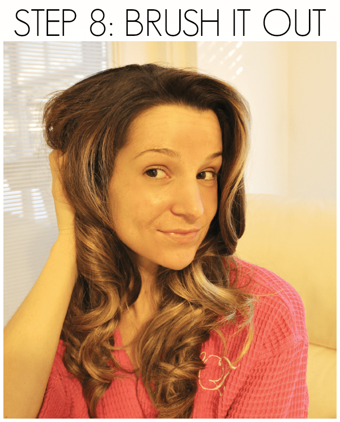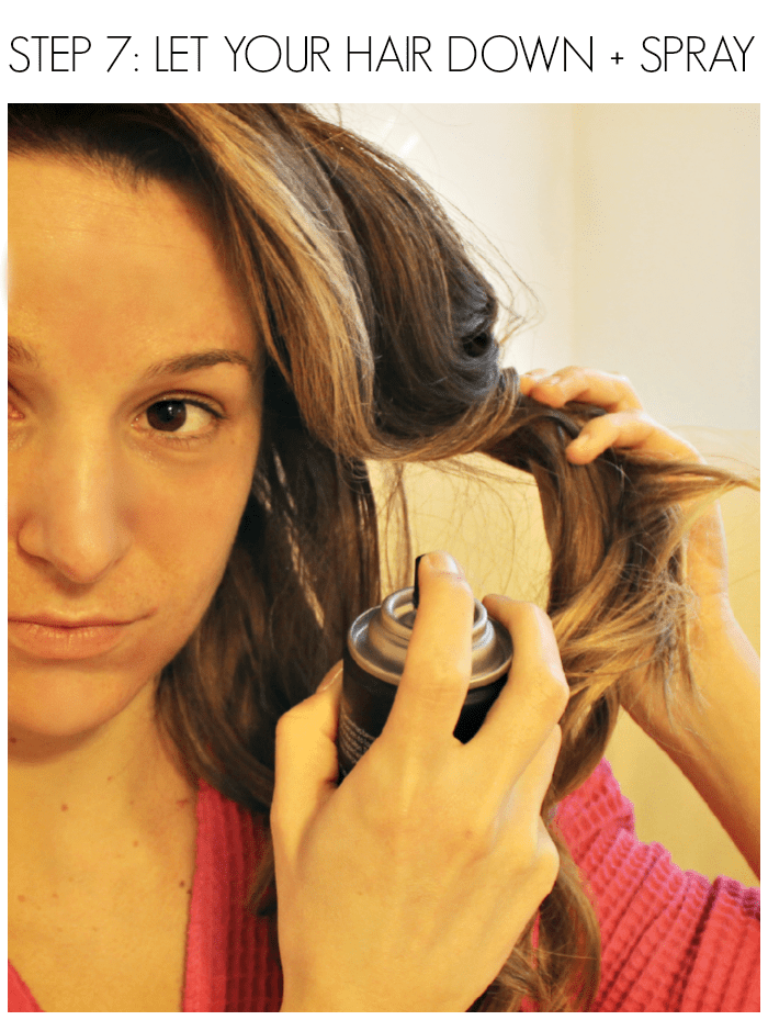 After 15 minutes minimum of curling time, let your hair down. Again, I despise crispy helmet hair, so I like to spray under my curls instead of on top of them. Your hair may not need any additional product depending on how well it holds a curl, but I usually need a little extra security.