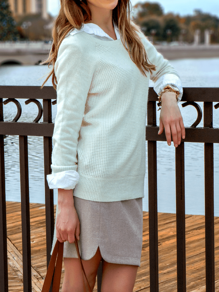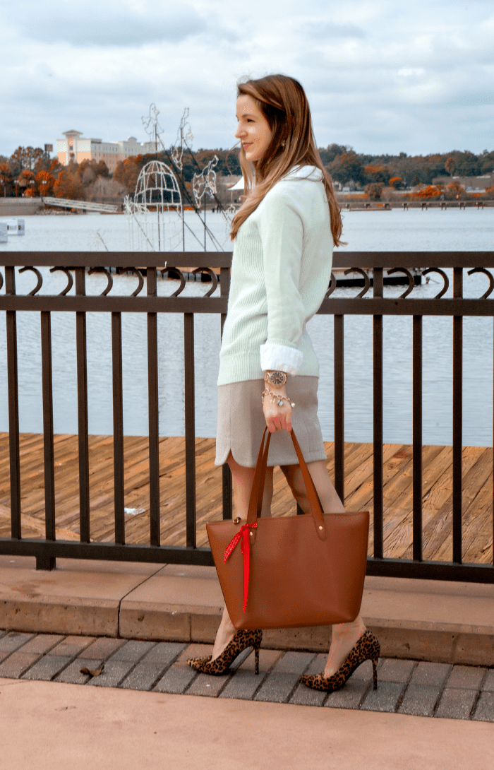 Sweater: J. Crew | Oxford: J. Crew | Skirt: J. Crew | Bag: Ralph Lauren Similar | Heels: Lauren Conrad Similar | Watch: Michael Kors Similar | Bracelet: Juicy Couture